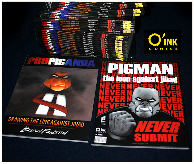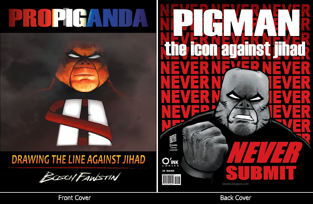 The book is square-bound, 9 x 11, 128 pages, 75 of them color, the rest black & white for $20. The book is filled with poster-type images of the main characters, mainly of Pigman, as well as a number of essays I've written on all things Islam and Jihad. This blog was meant to be a way to get myself out there while working on THE INFIDEL, so these images are now exclusive to this collection, though a few of them may end up as individual covers of The Infidel series.